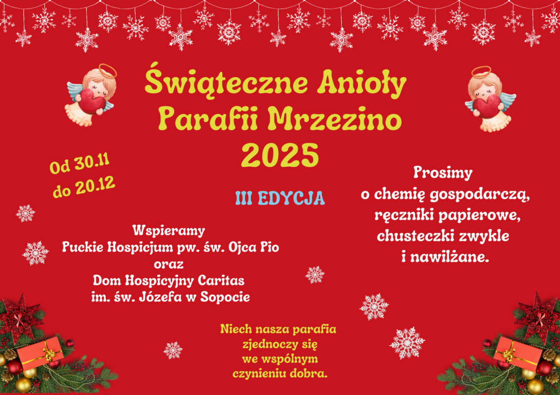 Rozpoczynamy III edycję „Świątecznych Aniołów Parafii Mrzezino”— wyjątkowej akcji, w której każdego roku pokazujemy, jak wielkie serca biją w naszej Wspólnocie. ![]()