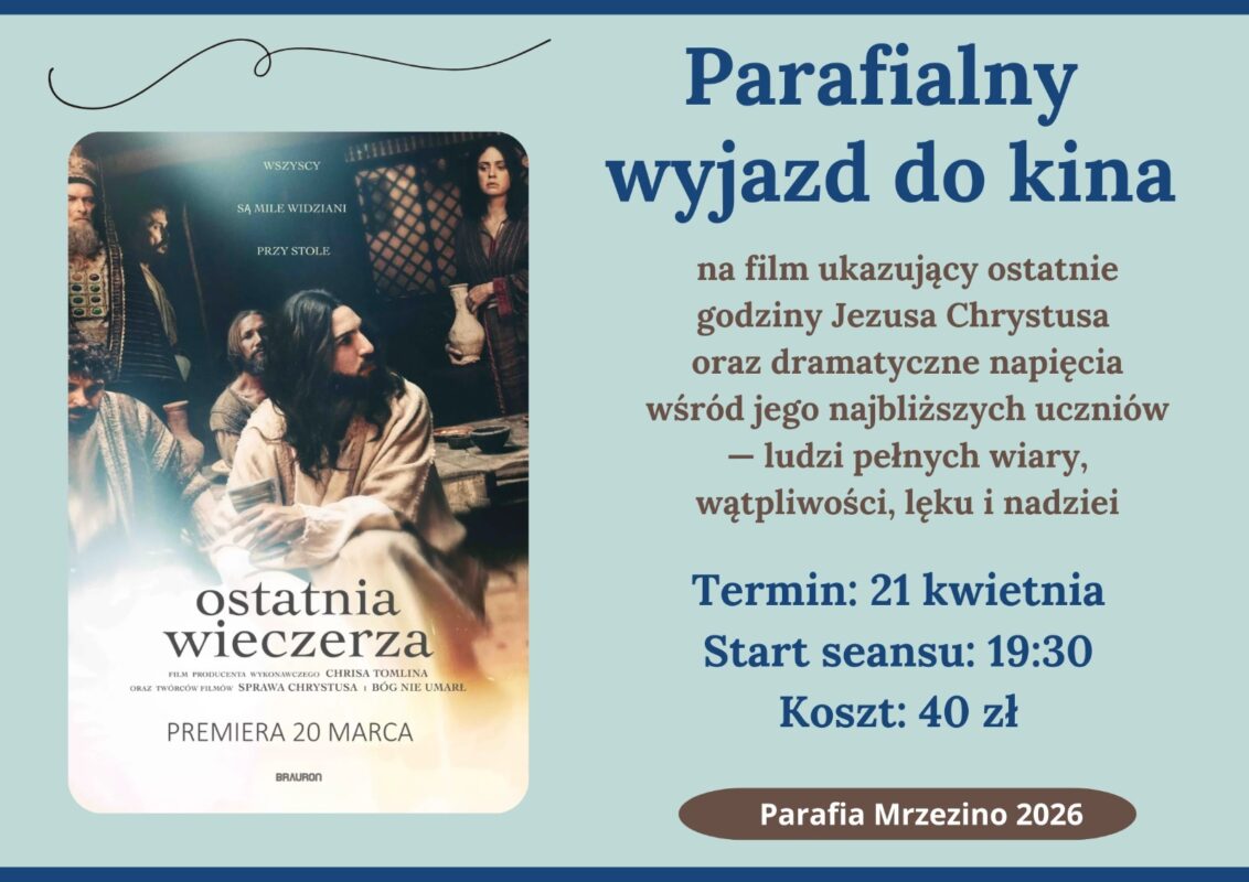 AktualnościWYJAZD DO KINA 10 kwi W odpowiedzi na sugestie naszych Parafian, organizujemy kolejny wyjazd do kina. Tym razem na film „Ostatnia Wieczerza”. Zapisy w zakrystii. Szczegóły na plakacie. Serdecznie zapraszamy, mamy tak jak ostatnio 60 miejsc. ŻYCZENIA WIELKANOCNE GODZINA MIŁOSIERDZIA
